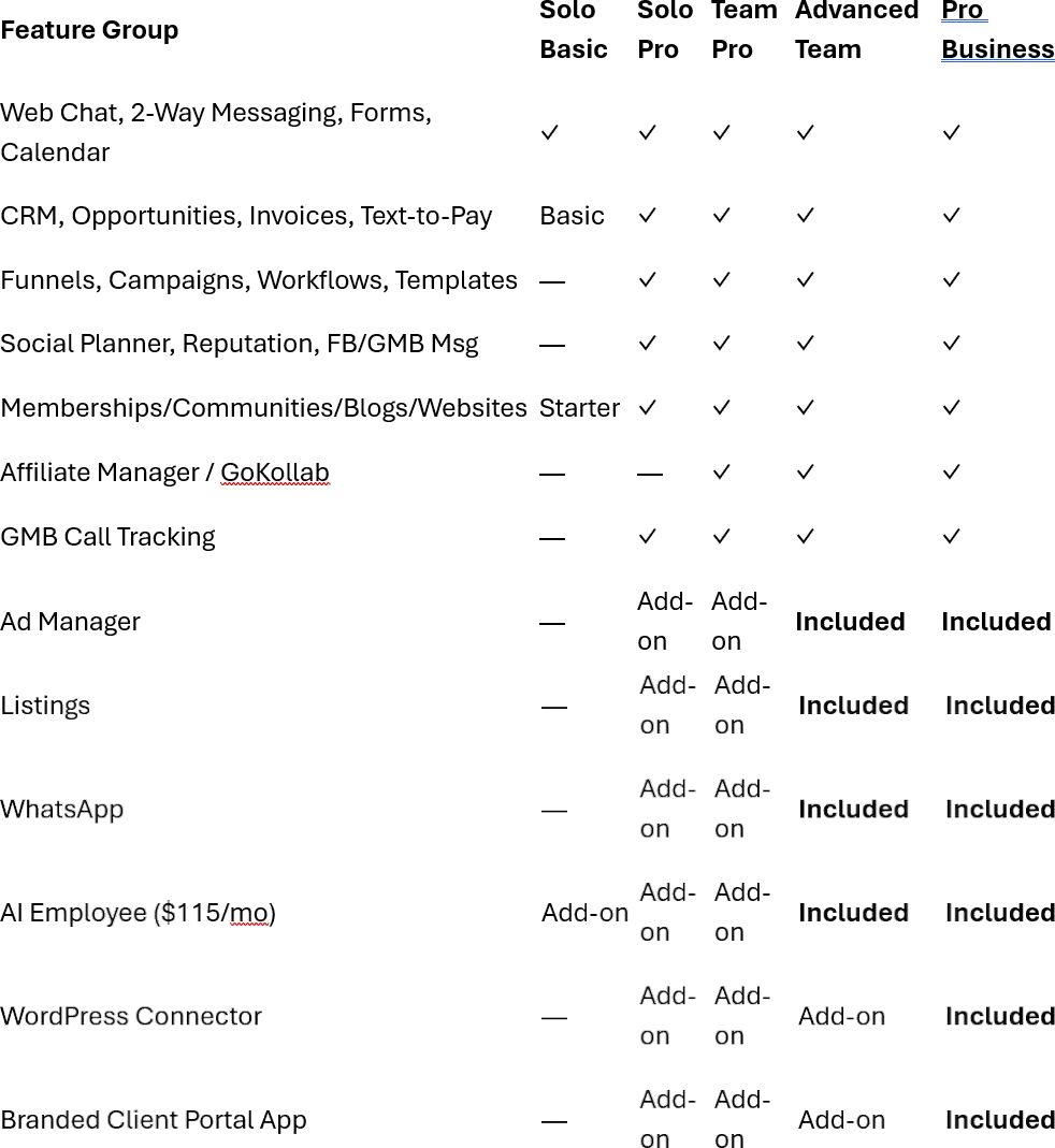 Popular add-ons: Funnels, Websites (multi-page), Blogs, Reputation Management, Social Planner, SMS/Email Templates.